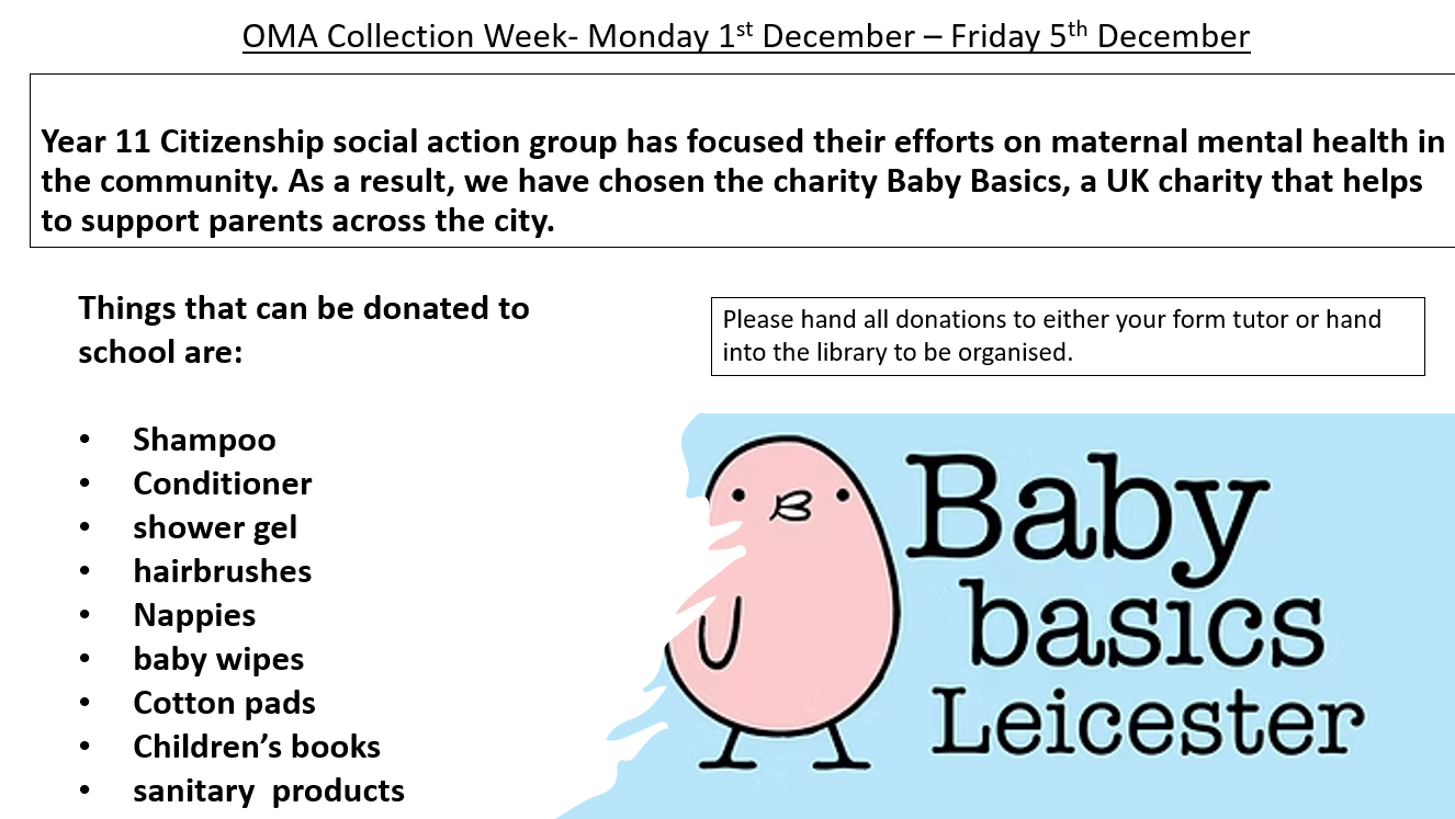 Our Year 11 Citizenship Social Action Group are collecting donations for Baby Basics, supporting parents and families across our city.  We’re asking for your help — any donation, big or small, makes a huge difference. Together, we can make a difference