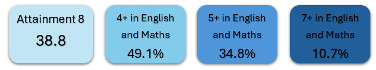 This highlights our continuous improvements in GCSE results, with Attainment 8 increasing by 1.8, 5+ in English and Maths increasing by 7.2% and 7+ in English and Maths increasing by 6.4% compared to 2023/2024.