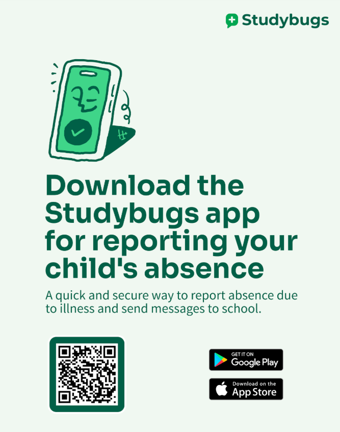 From now until Friday 8th May, we kindly ask that you download the free Studybugs app or register via the Studybugs website and use it to notify us whenever your child is unable to attend school due to illness.